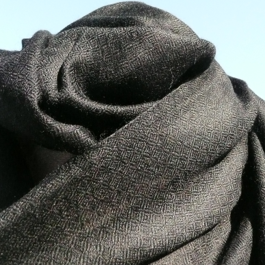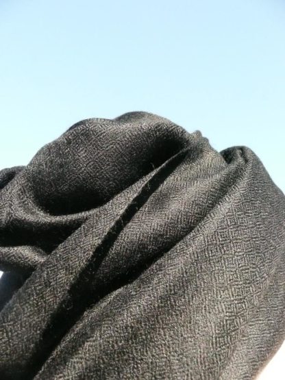 schwarze Stola aus 100% Cashmere. So fein und zart, dass Sie nur von einem Hauch von Stoff umkuschelt werden, so hochwertig, dass Sie wohlige Wärme verspüren. Die Stola aus 100% Cashmere ist ein Ringschal, das heißt Sie können die Stola durch einen Ring hindurch ziehen. Die Fransen sind offen.